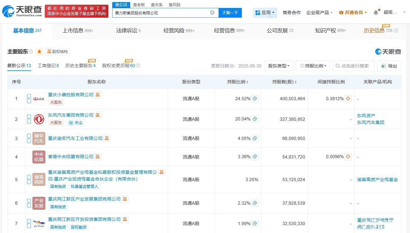 赛力斯集团股份有限公司成立于2007年5月,法定代表人为张正萍,经营范围包括制造销售汽车零部件、机动车辆零部件等。股东信息显示,该公司由重庆小康控股有限公司、东风汽车集团有限公司等共同持股。
